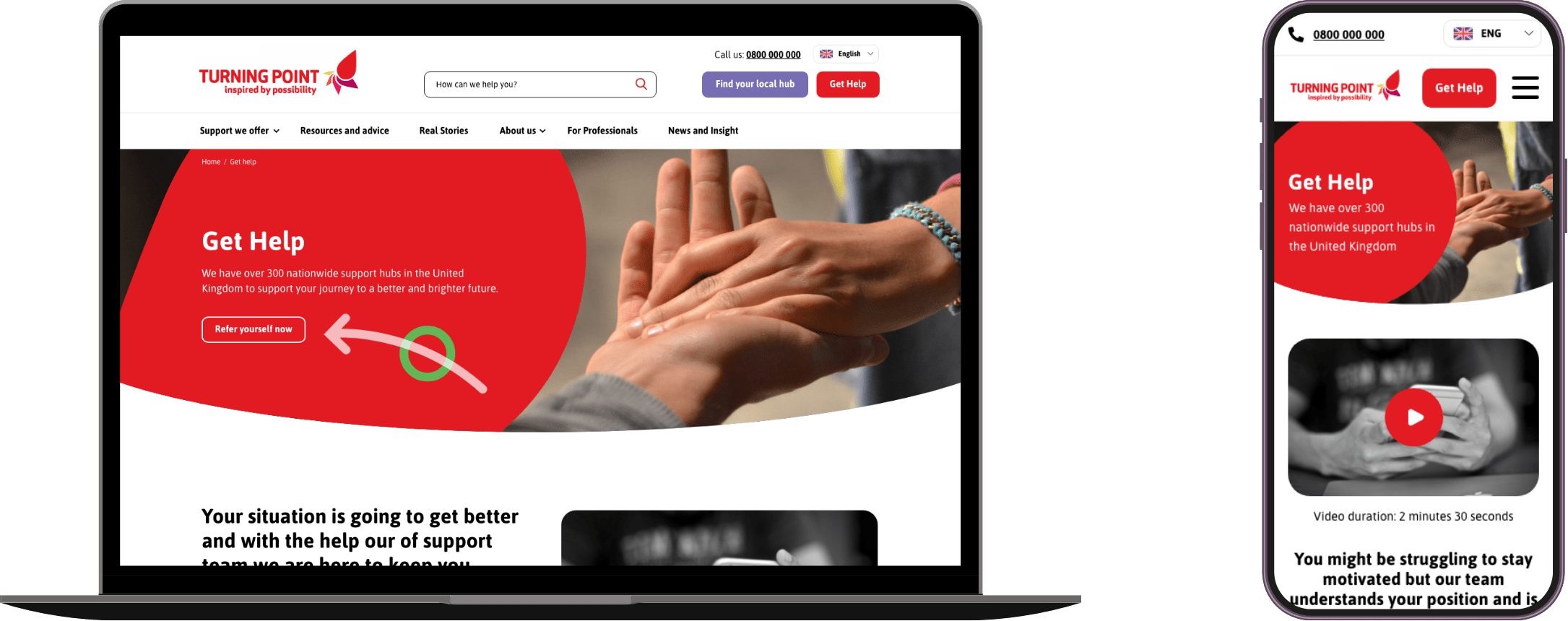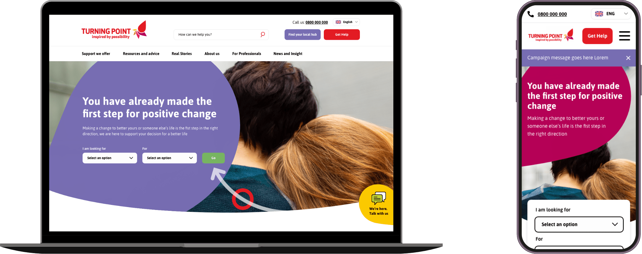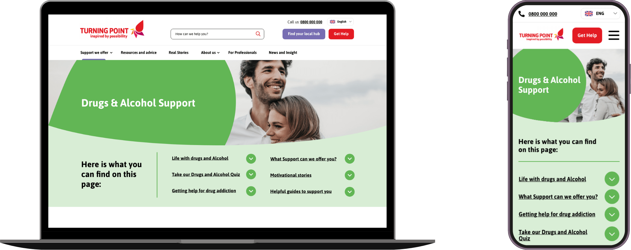 Turning Point provides support for a wide range of needs, and as their services expanded across the UK, the website structure became increasingly complex, with multiple overlapping user journeys. They required a new website that would resonate both with people seeking support and with organisations looking to sponsor and support their work.